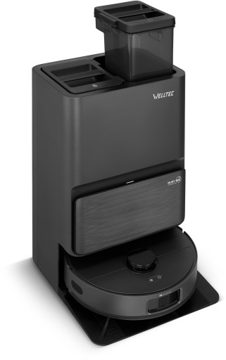 Welltec R90 Pro jest wyposażony w wydajną, wielofunkcyjną stację dokującą. Stacja posiada 3 oddzielne, łatwo dostępne zbiorniki – na wodę czystą, wodę brudną i kurz. Dolna część stacji wyposażona została w styki ładowania z czujnikami, porty do zasysania kurzu, mycia mopów i zbierania brudnej wody, podstawkę czyszczącą i dyszę gorącego powietrza. Dzięki rozbudowanej konstrukcji, stacja dokująca robota R90 Pro zapewnia użytkownikowi bezprecedensową wygodę.