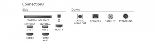USB, HDMI 2,0, wyjście słuchawkowe, cyfrowe optyczne/cyfrowe wyjście audio i CI / CI+